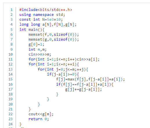 这样就转换成了一道背包题目,而这道题与以往不同的是,要求的是可以获得m权值的方案数,转化一下,就是说相当于求最优方案的总数