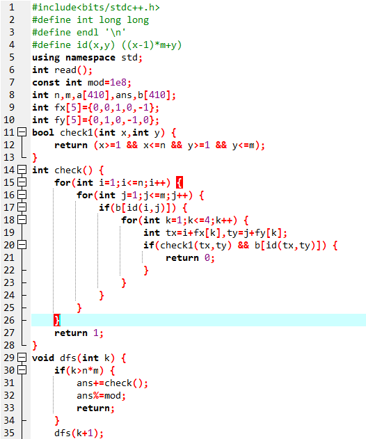 采用轮廓线 DP。设 f_{i,j,k} 表示当前点在 (i,j),轮廓线的状态是 k 的方案数