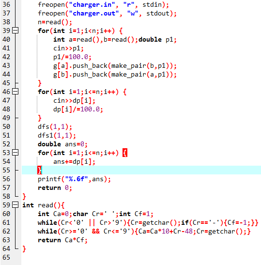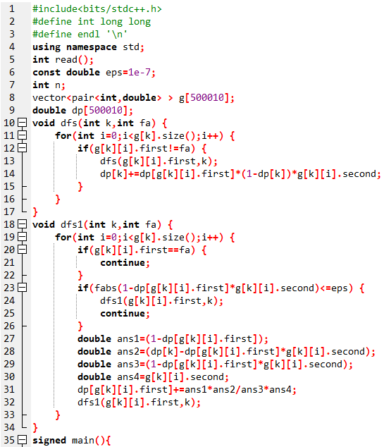 在第一遍dfs的过程中,h_{i} 表示第 i 个节点通电的概率,且电一定来自它自己或者它的子树里(对应第一第二种情况),在第二遍dfs的时候被更新成为电来自于任何地方的概率(对应所有情况)