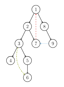 - 横叉边(cross edge):示意图中以蓝色边表示(即 9 \rightarrow 7),它主要是在搜索的时候遇到了一个已经访问过的结点,但是这个结点 并不是 当前结点的祖先。