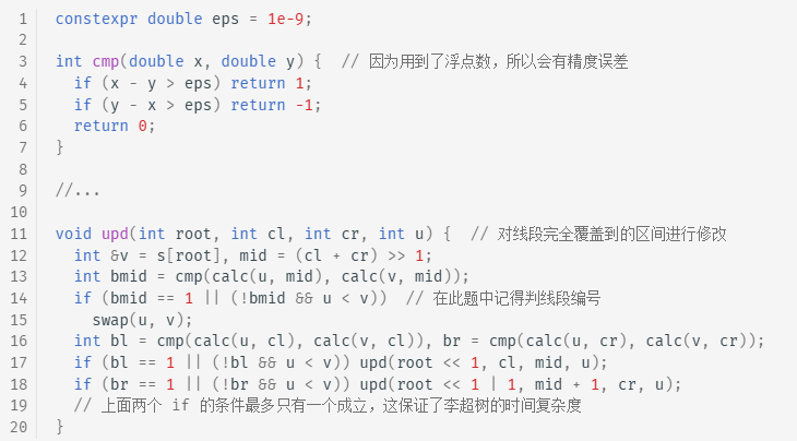 若合并若干李超线段树涉及的总点数为 n,则该过程的复杂度为 O(n\log n):对于任意线段在树上对应的节点,每次涉及移动它时,我们要么使其深度 +1,要么直接从树上删除,这两个操作的代价都是 O(1) 的,而每个点深度至多为 O(\log n),于是复杂度如上。