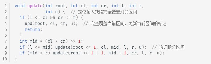 现在我们需要插入一条线段 f,考虑某个被新线段 f 完整覆盖的线段树区间。若该区间无标记,直接打上用该线段更新的标记。