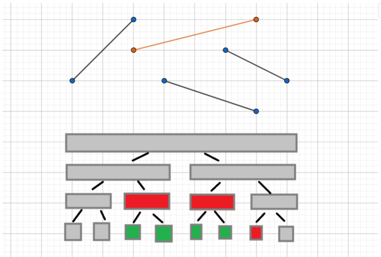如图,加入黄色线段后,只有红色节点的标记被更新,而绿色节点的标记还未被改变。但在第二、三、四个绿色区间的中点处显然黄色线段取值最大。