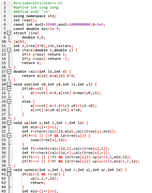 - 给定 k,求定义域包含 k 的所有一次函数中,在 x=k 处取值最大的那个,如果有多个函数取值相同,选编号最小的。