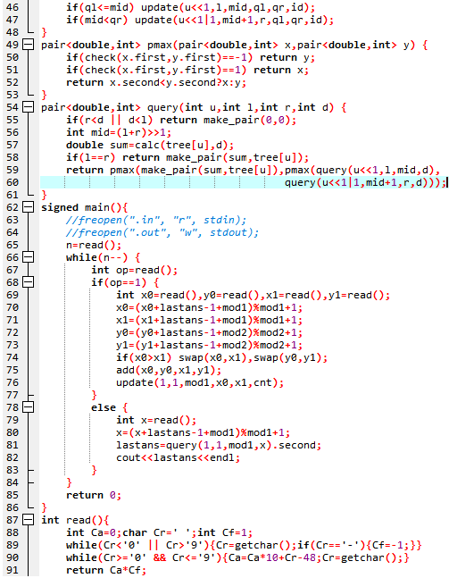 - 给定一个数 k,询问与直线 x = k 相交的线段中,交点纵坐标最大的线段的编号(若有多条线段与查询直线的交点纵坐标都是最大的,则输出编号最小的线段)。特别地,若不存在线段与给定直线相交,输出 0。
