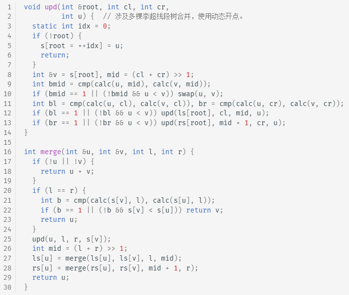 类似于普通线段树的合并,我们定义以下过程来将两个李超线段树节点 u,v 合并,作为新的根。