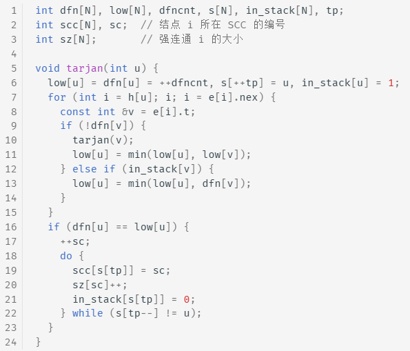 如果结点 u 是某个强连通分量在搜索树中遇到的第一个结点,那么这个强连通分量的其余结点肯定是在搜索树中以 u 为根的子树中。结点 u 被称为这个强连通分量的根。