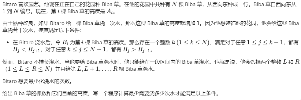 大概翻译一下就是求要将一个序列,经过多少次对某段区间内元素加一后,形成的新序列先单调递增,再单调递减(也可以是一个单调递增的序列或单调递减的序列)(是不是想起了合唱队形)