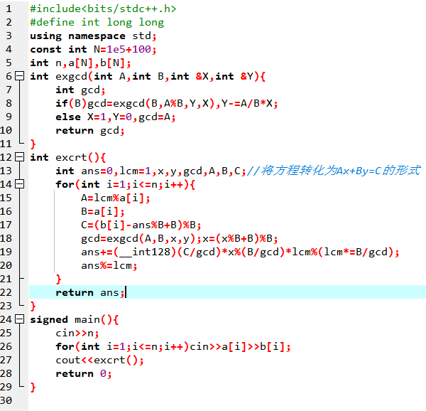 这里给出扩展中国剩余定理的模板(含扩欧模板),这是根据题解提炼出的更加一般化的形式,可以将同余方程组转换为如Ax+By=C形式后求解,x前的系数不必为1