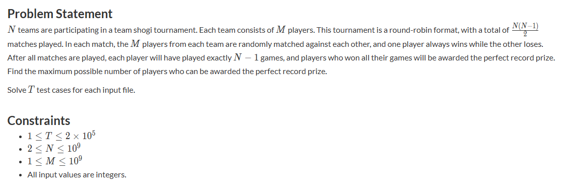 翻译:给出n个队伍,每支队伍有m个队员,每位队员会参加(n-1)场比赛,并对到其他队的不同队员,一个队员只会对到其他(n-1)支队伍各一次,问最多有对少队员可以赢下(n-1)场比赛