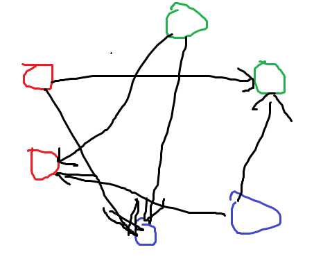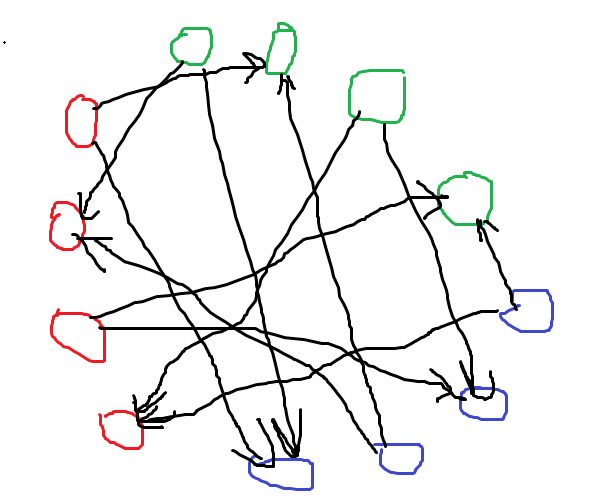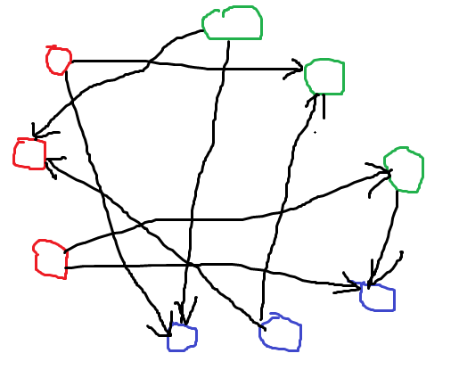 (说明,每个小圈代表一个队员,不同颜色代表不同队伍,败者向胜者连有向边)
