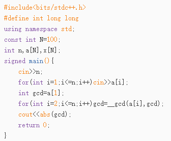 本体显然由裴蜀定理可知,要求的就是gcd(a1,a2,…,an),代码也很简洁