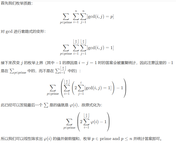 我的想法,对于素数p来说phi(p)=p-1所以我们可以用这个来判断,原题等价于求多少组(i,j)满足phi(gcd(i,j))=gcd(i,j)-1,然后推式子