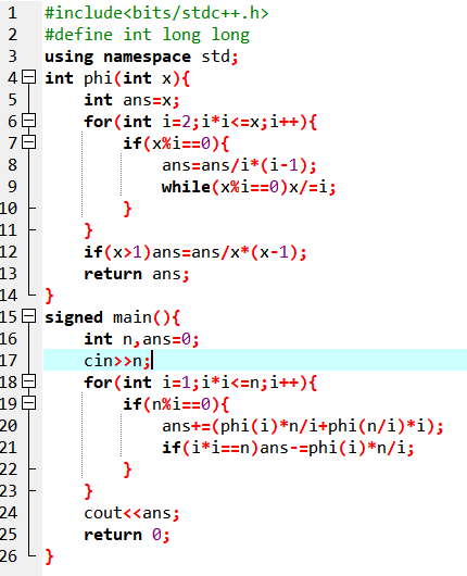 这题是练习欧拉反演的基础题,我认为也可以作为O(sqrt(n))求欧拉函数的模板题
