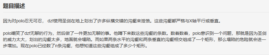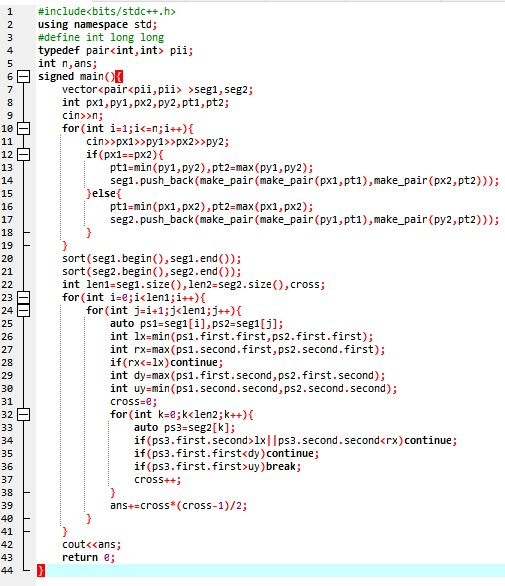 这题一开始我想的是把线段的交点全求出来后用对角线的交点枚举,判断能否构成矩形,但这样可能出现矩形中间有边是断开的情况被统计进去