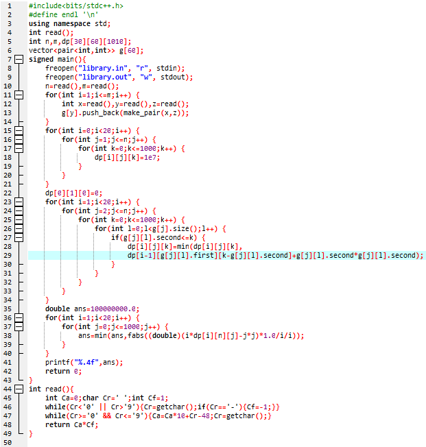 容易发现 dp_{i,j,k}=min(dp_{i,j,k},dp_{i-1,v,k-a_{v,j}}+a_{v,j}^2)