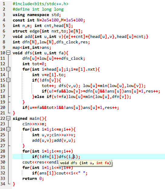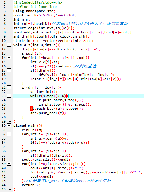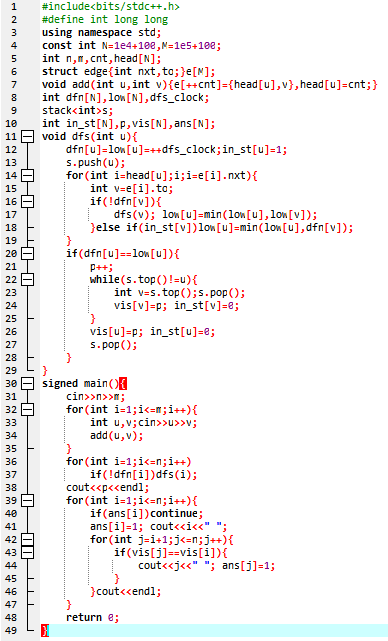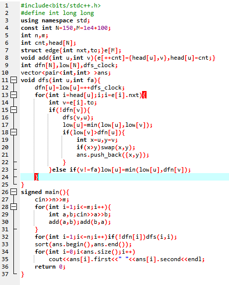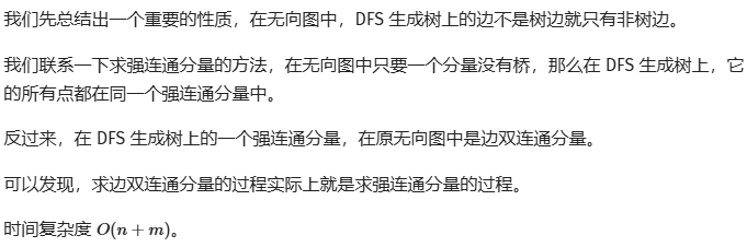 我们可以根据定义求解,注意到边双连通分量中不存在桥,因此我们可以先将所有的桥求出,再用DFS求解边双连通分量