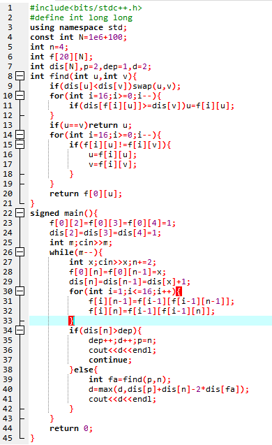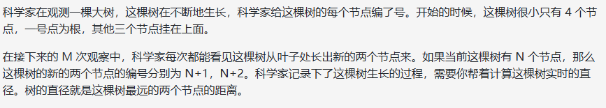 考虑到一个显然的事实,若新增节点使得树的深度增加,答案就是原来的直径加一,若没有则考虑深度最深的结点和新增节点配对,看两点间距离是否比原来更大