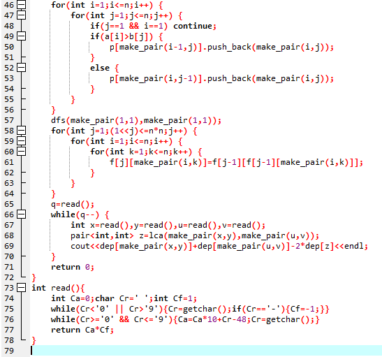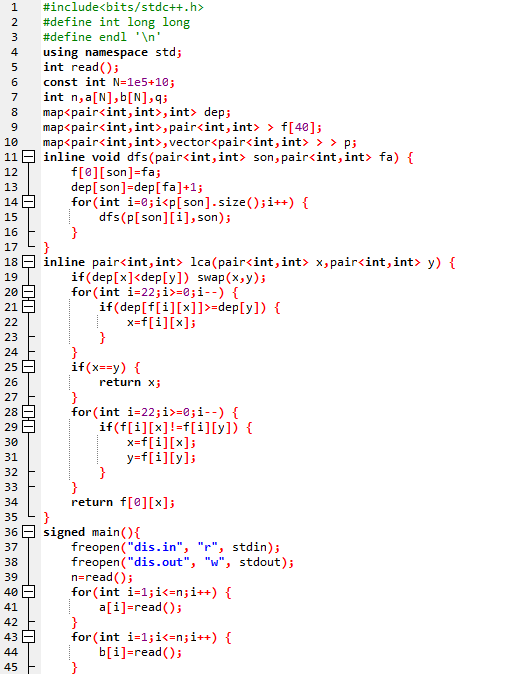 输出 q 行,每行一个数,表示 (x,y) 与 (p,q) 在这棵树